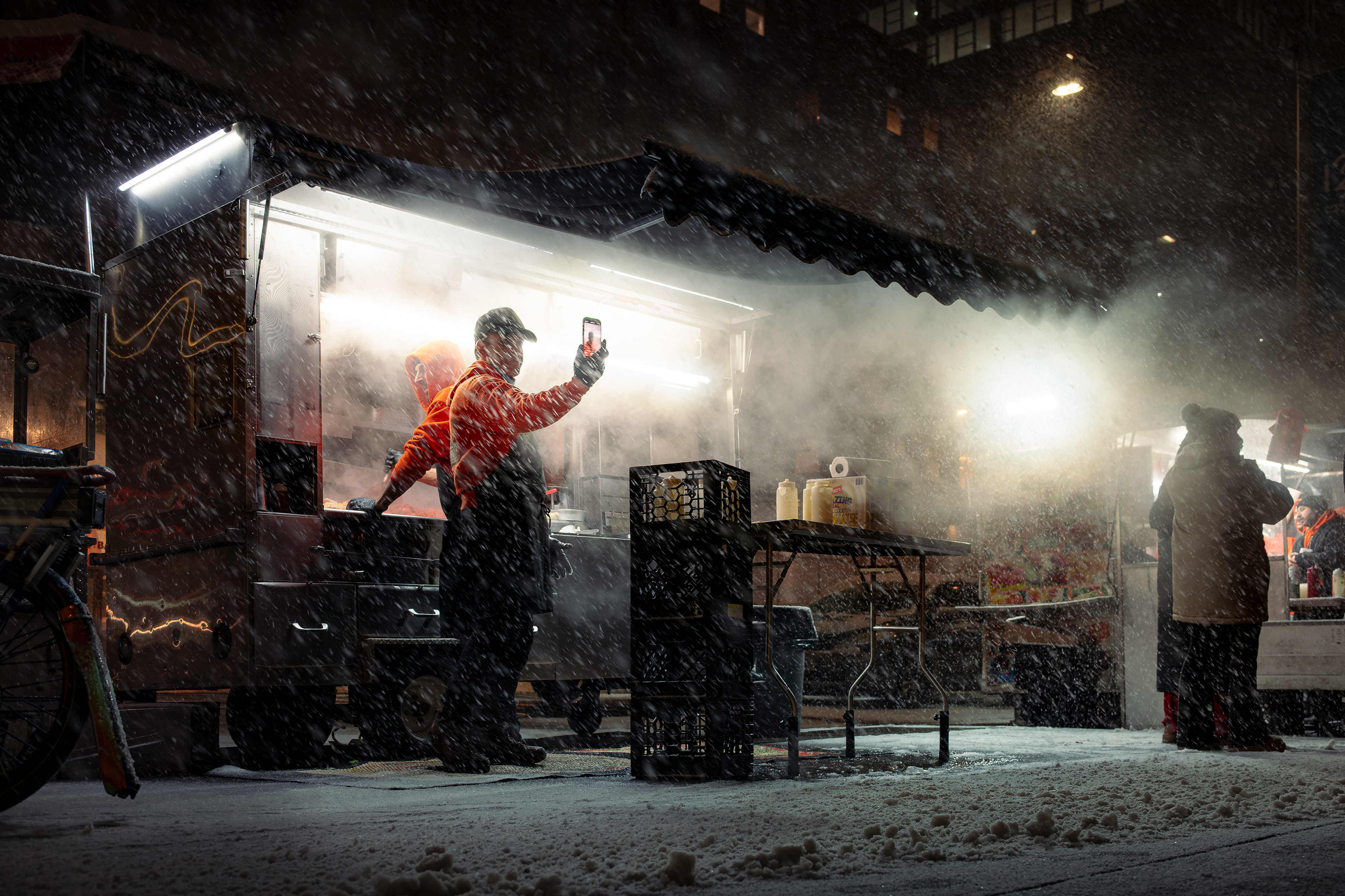 Steamy, snowy nights in Manhattan. This guy was loving it.